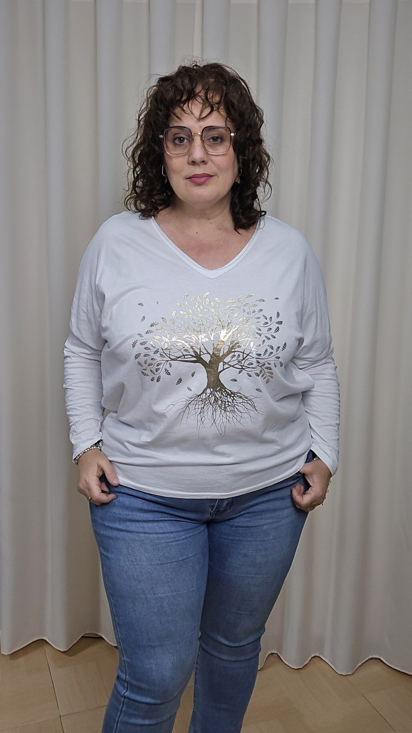 Bonita camiseta de algodón con en árbol de la vida en dorado.